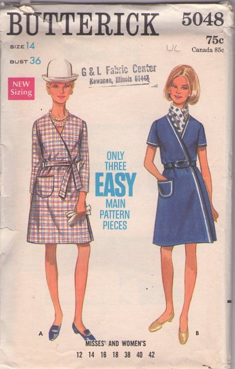 Butterick 5048 Vintage 60's Sewing Pattern Mod Wrap Dress, Easy Front Wrap Around, V Neck Dress Size 14