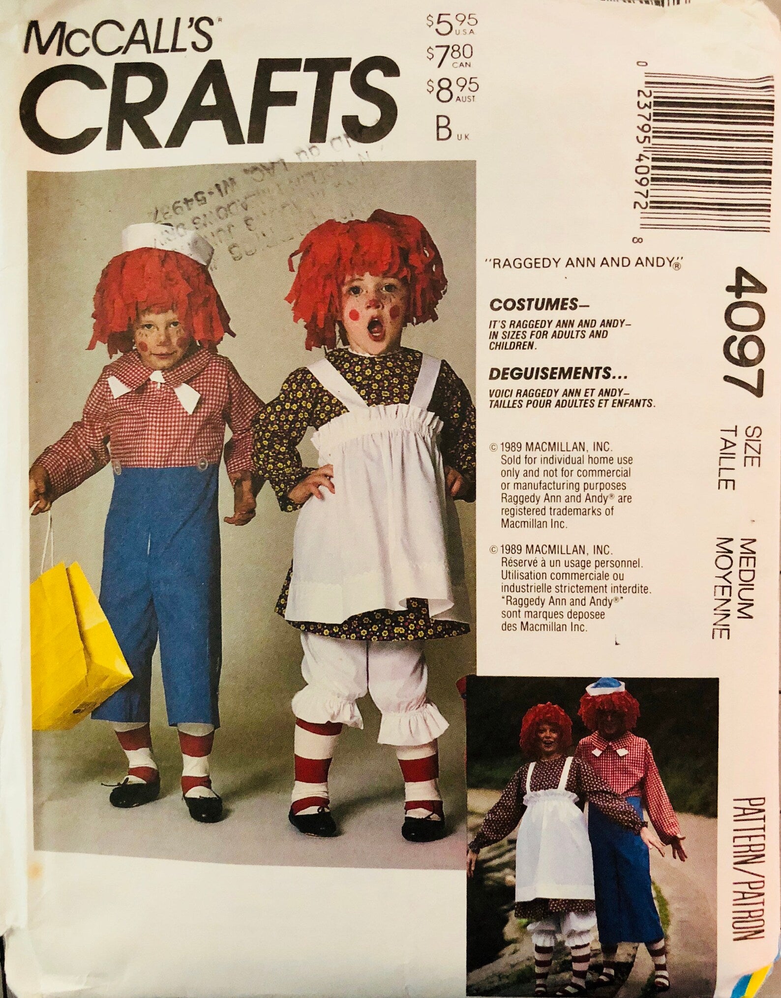 McCall's 4097 Vintage 80's Sewing Pattern Character Costumes, Couples' Halloween Costumes Raggedy Ann & Andy Jumpsuit, Dress, Pinafore Apron, Bloomers & Yarn Hair Wigs Adult Medium