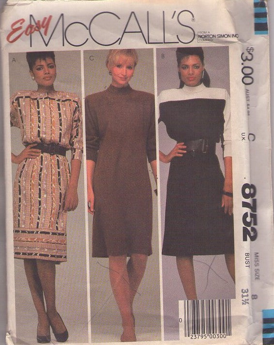 McCall's 8752 Vintage 80's Sewing Pattern Secretary Dress, Contrast High Yoke, Straight Fit 3 Styles Size 8