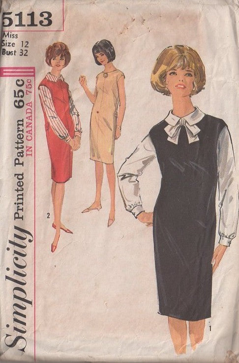Simplicity 5113 Vintage 60's Sewing Pattern Secretary Dress, Blouse, Jumper, Slight Cap Sleeve Jumper Dress, Tie Collar Long Sleeve Office Secretary Blouse Size 12