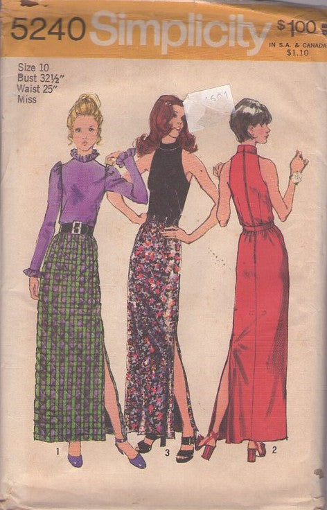 Simplicity 5240 Vintage 70's Sewing Pattern Blouses & Skirts, Cut Away Armholes, Back Zippered Disco Blouse, Shirt with Ruffles, High Slit Maxi Skirt, 2 Piece Party Dress Size 10