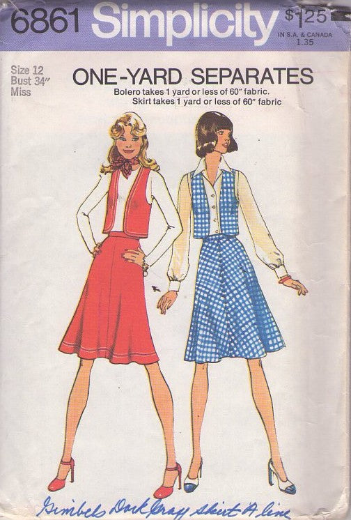 Simplicity 6861 Vintage 70's Sewing Pattern Easy Bolero & Skirt, 1 Yard Fabric Bolero Vest & Flared Bias Secretary Skirt Size 12