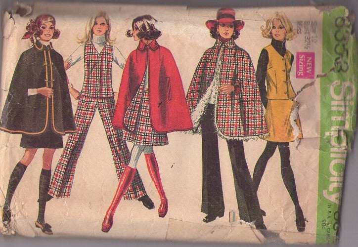Simplicity 8353 Vintage 60's Sewing Pattern Mod Cloaks, Twiggy Faux Fur Lined Poncho Cape, Cloak, Arm Slits, Vest Top, Mini Skirt & Pants Size 10