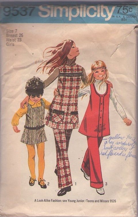 Simplicity 9537 Vintage 70's Sewing Pattern Girl's Dress, Pants, Brady Bunch Era 3 Neckline Tunic Top, Mini Jumper Dress, Pants, Pantsuit Size 7