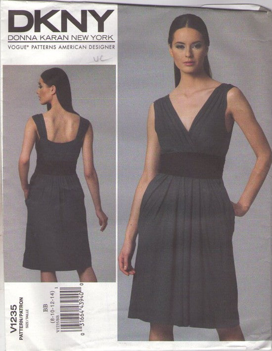 Vogue 1235 Retro 2011 Sewing Pattern American Designer Dress, Donna Karan New York DKNY, Gathered Midriff, V Neck Surplice, Bare Back Cocktail Party Dress Size 8-14