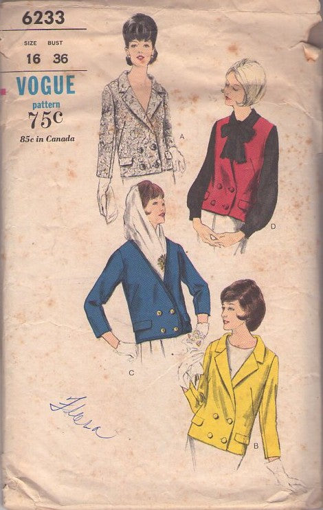 Vogue 6233 Vintage 60's Sewing Pattern Jacket Set, Nautical Vibes, Jackie O, Mad Men, Double Breasted Suit Jacket, Vest Set Size 16